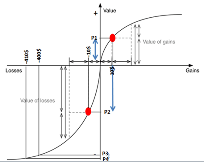 Como muestra el gráfico de Kahneman y Tversky (ver anexo 1) la pendiente de la curva se hace cada vez menos inclinada a medida que la curva se aleja del centro. Cuando un individuo gasta o pierde 10 dólares, la curva tiene una pendiente pronunciada, lo que representa que esa pérdida de 10 dólares tiene una respuesta negativa significativa, y en el gráfico tiene un valor emocional de 0 a P2. Sin embargo, un gasto de 10 dólares después de haber gastado 400 dólares no tiene la misma respuesta emocional. Como se muestra en el gráfico, la pendiente es mucho menos pronunciada lo que indica que la respuesta emocional es mucho menor y en el gráfico tiene un valor de P3 a P4.